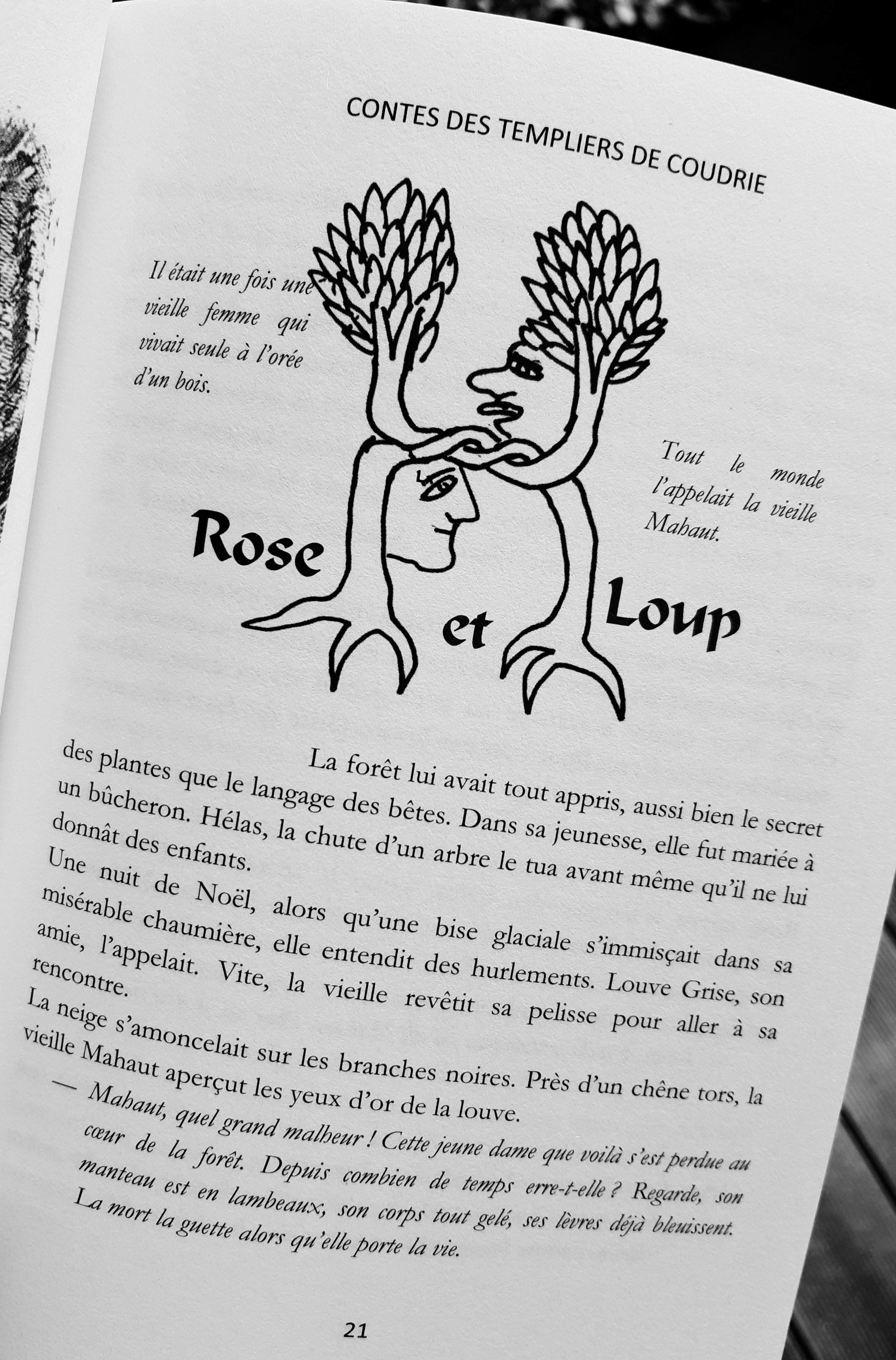 La vieille Mahaut recueillit les deux enfants. Elle retrouva le trousseau qu’elle avait préparé dans sa jeunesse, en revêtit les nouveau-nés, les choya. Pour rendre hommage au teint délicat de sa mère, Mahaut appela la fillette Rose. Pour honorer Louve Grise qui les avait sauvés, elle appela le garçonnet Loup. (extrait)