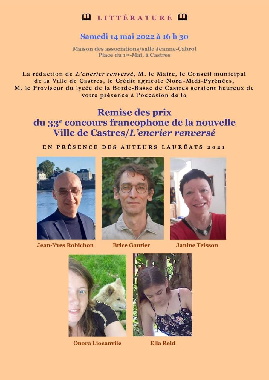 Cette nouvelle vient d’être distinguée par le jury du 33ème concours francophone de la nouvelle, organisé par la revue l’Encrier Renversé. Elle a obtenu le deuxième prix et est publiée dans le n°90 de la revue.