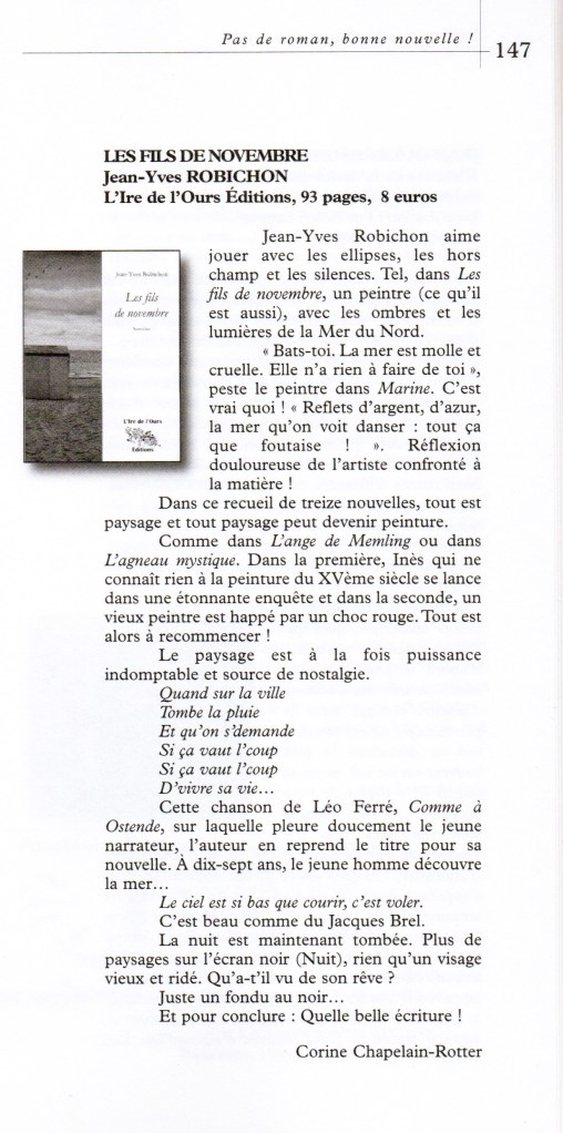 Mon recueil de nouvelles intitulé : LES FILS DE NOVEMBRE, publié dans la collection La petite Ourse aux éditions l’Ire de l’Ours est disponible en librairie et sur les sites de vente en ligne.